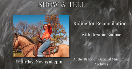 Join Dezarae Bodnar to hear her observations on the journey of the final year of the Sioux Valley Dakota Nation Unity Riders Truth and Reconciliation ride across Southwestern Manitoba. From Birtle to Elkhorn to Brandon Indian Residential School sites. This special Show & Tell talk is coming up on November 15 at 2pm.